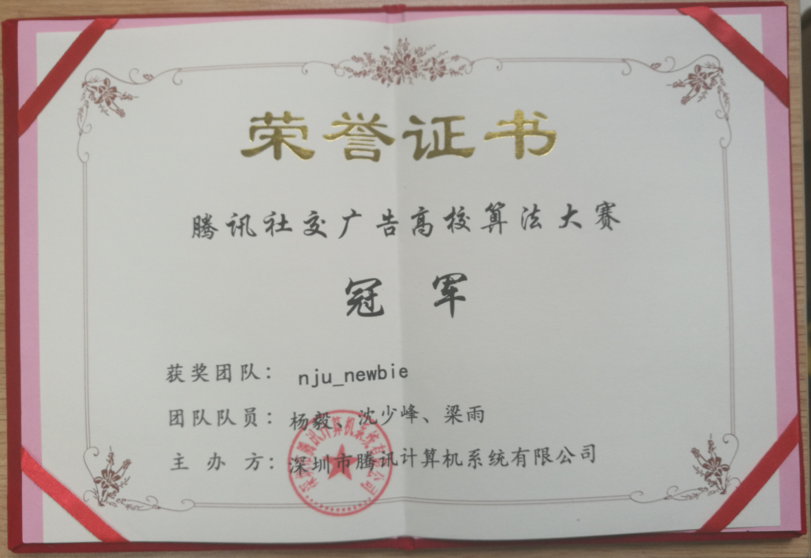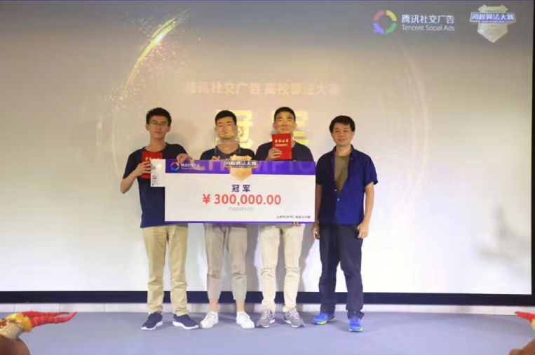 2017年7月6日,首届腾讯社交广告“高校算法大赛”在深圳腾讯大厦举行了现场答辩及颁奖典礼。经过历时近 2 个月的激烈角逐,我系机器人智能与神经计算研究组(//52avone.net/rinc/index.html)的“nju_newbie”战队(成员:杨毅,沈少峰,梁雨,指导教师:申富饶)以领先优势夺得冠军,获得 30 万奖金。腾讯社交广告总经理罗征为冠军战队颁奖。出席者还包括腾讯公司副总裁林璟骅、腾讯公司副总裁王巨宏女士、腾讯社交广告质量研发中心总监靳志辉、精准推荐中心总监肖磊、腾讯云技术总监黄希彤、商业数据产品中心总监管琰平以及新加坡资讯通信研究院数据分析研究所所长李晓黎。本次比赛吸引了近 18000 名高校学生积极参与,参赛者遍布中国大陆、香港、美国等国家及地区。最终来自52AV ,清华大学,北京大学,复旦大学,吉林大学,大连理工大学等高校的全国十强战队在深圳腾讯大厦进行了现场答辩。