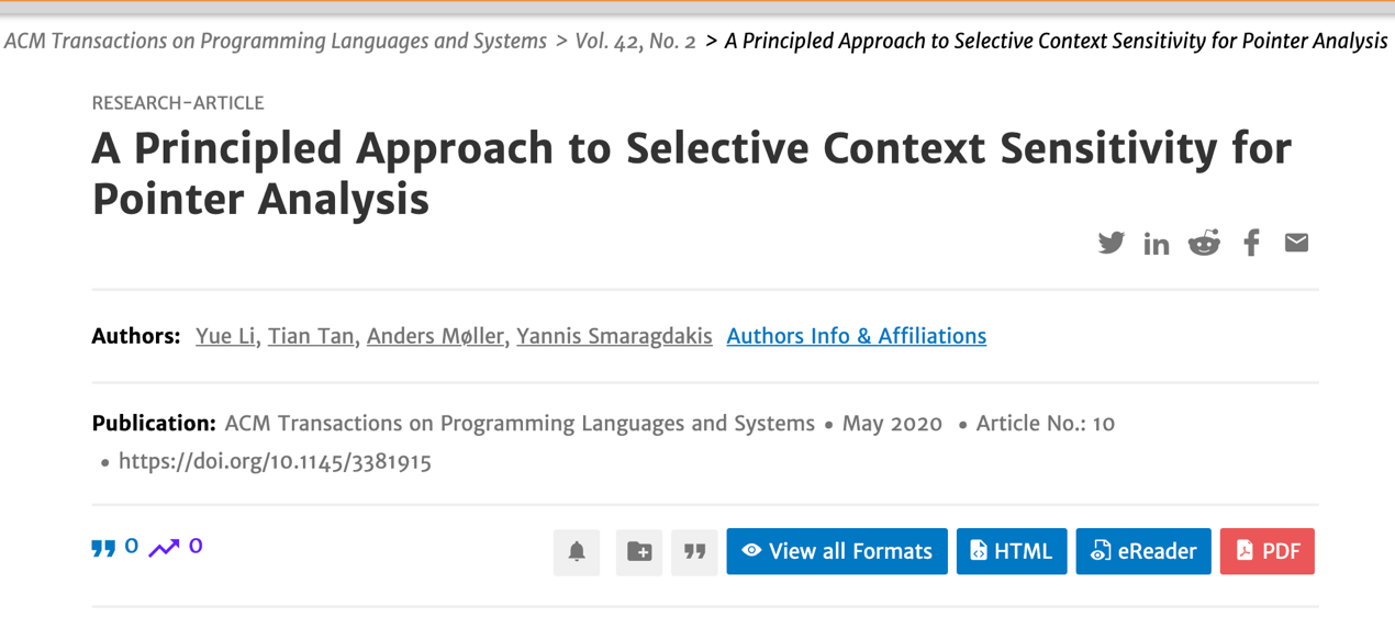 该成果在2020年5月20日,以“A Principled Approach to Selective Context Sensitivity for Pointer Analysis”为题发表于《ACM Transactions on Programming Languages and Systems》期刊上(TOPLAS 42(2)),52AV 为第一及通讯单位,李樾为第一作者,谭添为通讯作者,丹麦奥胡斯大学Anders Møller教授、希腊雅典大学Yannis Smaragdakis教授为合作者。TOPLAS是程序设计语言领域的顶级国际期刊,也是CCF推荐A类期刊。该论文是TOPLAS自1979年创刊41年来,52AV 首次、我国内地高校和科研机构第三次(近五年唯一)以第一单位名义发表的科研成果。