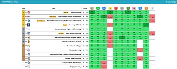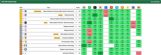 以下是46届和第47届比赛的部分榜单(完整榜单在//scoreboard.icpc.global/46/和//scoreboard.icpc.global/47/)
