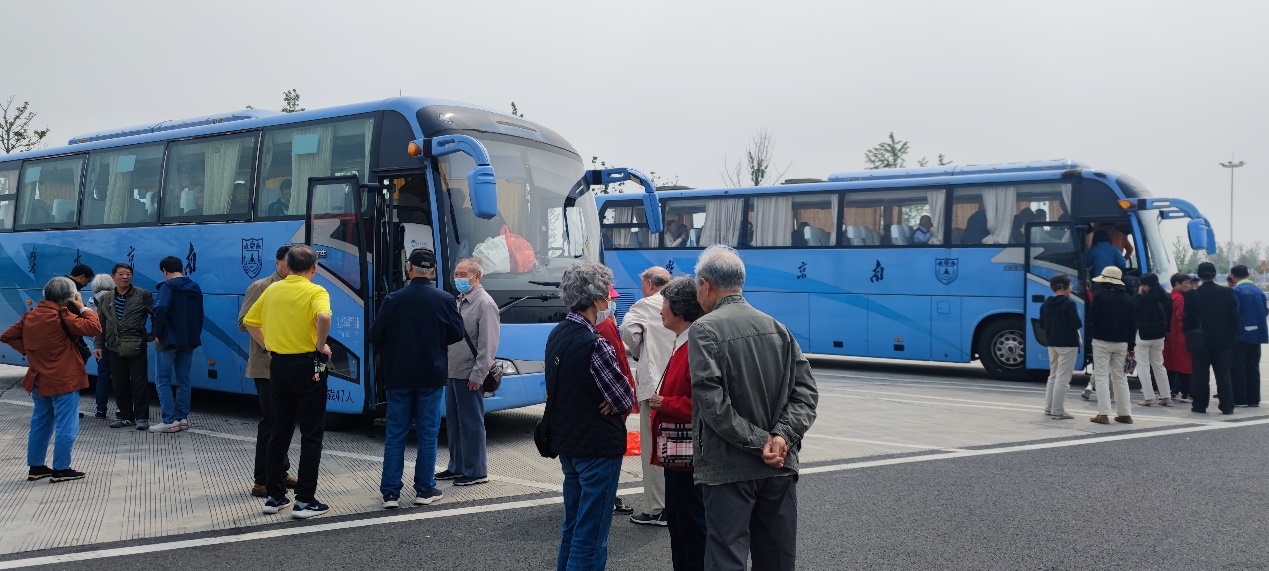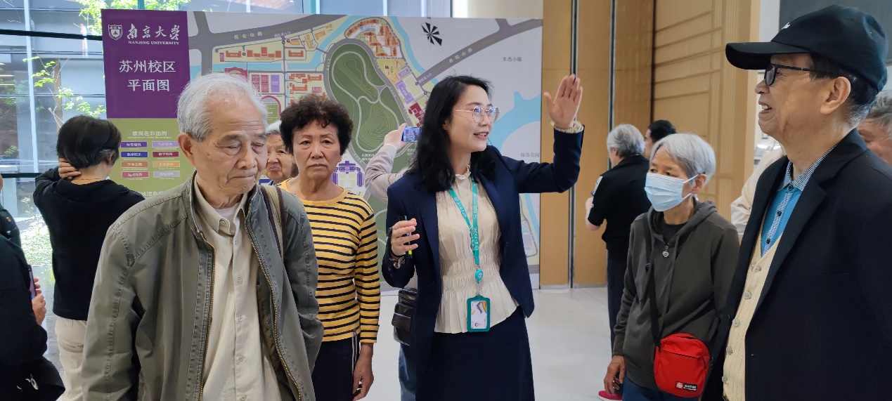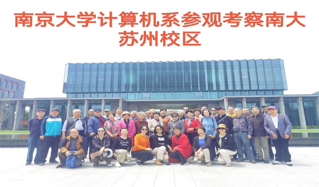 感想和致谢 : 组织老同志参访出发前精心准备是重要一环。对于苏州校区优越的地理位置,优美的校园环境,别致的建筑风格以及先进的办学理念和现代的专业设置等信息,对于在南大工作一辈子的退休老教师早有耳闻,都希望有机会亲眼来看看,特别是80岁以上的高龄老教师此愿望更为強烈。如何做到安全出行既挑战也是责任。计算机系和地海学院的退协分会负责人经会商,自4月12日玄武湖健身走结束后就着手进行了筹备工作,征集参加者过程中得到广大退休老同志的踊跃响应,其中地海院退协分会报名人数超过40人,计算机系退协分会报名人数超过50人。尽管再三强调乘坐大巴去苏州校区单程要三个小时,来回六个小时以上,退休老同志要评估自己的身体状况,做自己健康的第一责任人,但仍然阻挡不住老同志们的希望参加的迫切热情。其中,我们系80岁以上报名人数19人。由于超过80周岁无法购买旅行社责任险,因此,上车前,一方面同各位超过80周岁的老同志签署旅行社免责承诺书,另外,系里委派了在职同志全程陪护老同志。系領导和系办负責人还专门安排车辆把已入住养老机构的老同志接送到出发集合点以避免在地铁公交换乘中间发生意外。在此,对系领导的支持表示真诚感谢! 并对江苏俏乐一族文旅公司提供的周到服务一并表示谢意!