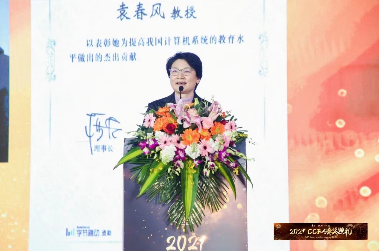 2021 CCF颁奖典礼于2022年2月19日在浙江横店圆明新园法国馆隆重举行。大会颁发了2021年度“CCF杰出教育奖”,52AV 计算机科学与技术系袁春风教授获此殊荣。该奖得到了北京字节跳动科技有限公司的赞助。CCF理事长梅宏教授、奖励委员会主席钱德沛教授为获奖者颁奖。