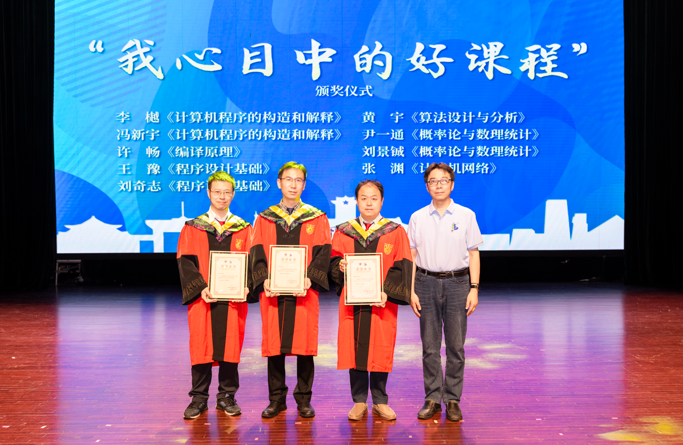 在毕业启程之际,2025届本科毕业生积极参与“我心目中的好课程”评选活动,根据投票结果产生了深受同学们欢迎的优质课程和优秀授课教师。获奖课程与教师名单如下:李樾老师和冯新宇老师《计算机程序的构造和解释》、许畅老师《编译原理》、王豫老师和刘奇志老师《程序设计基础》、黄宇老师《算法设计与分析》、尹一通老师和刘景铖老师《概率论与数理统计》、张渊老师《计算机网络》。52AV 软件学院人工智能学院党委书记武港山老师为获奖课程和获奖老师代表颁奖。
