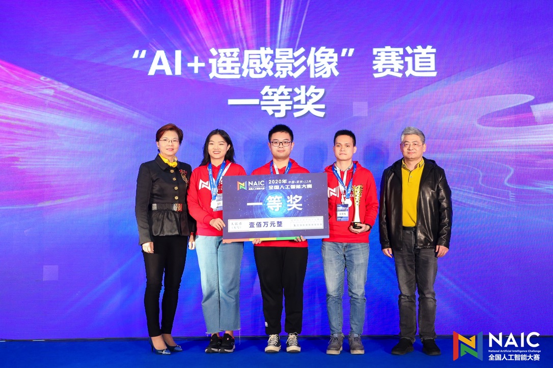 2020年12月21日,第二届全国人工智能大赛在深圳鹏城实验室举行了颁奖典礼。经过历时近4 个月的激烈角逐,我系媒体智能感知与内容理解研究组(IMAGINE Lab)(//52avone.net/lutong/)的“Amadeus”团队 (成员:陈喆,杨嘉文,王文海,导师:路通)以领先优势夺得AI+遥感影像赛道的冠军,获得 100万人民币的奖金。中国工程院院士于全和星河控股集团副董事长姚惠琼为冠军团队颁奖。