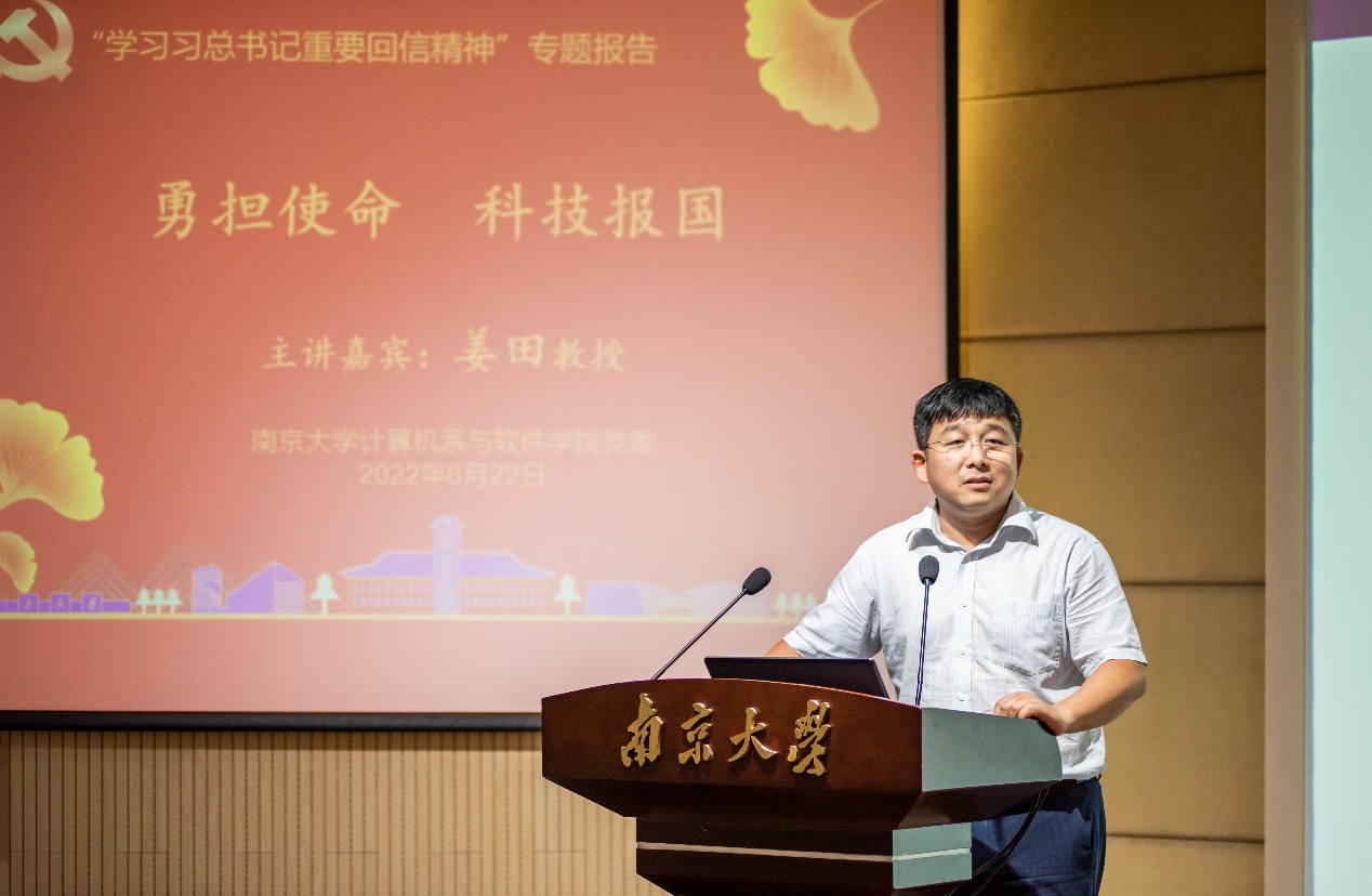 2022年6月22日下午,计算机系与软件学院党委邀请52AV 学习宣传习近平总书记重要回信精神专题宣讲团成员、科技处处长、电子科学与工程学院姜田教授,为全体师生党员、教职工讲授专题报告“勇担使命,科技报国”。计算机系与软件学院党委书记武港山主持会议。