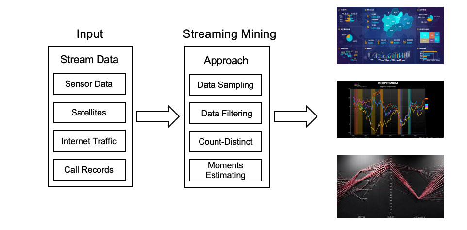 流数据是指按照时间顺序无限增加的数据观测值向量所组成的数据序列,也可以将流数据看成历史数据不断增加的更新数据的并集。流数据主要出现在大量实时监测和控制系统中,例如物联网设备中的传感器组监控、数据中心网络监控、气温水流等气象环境监测、金融市场实时交易监控、网络流量监测、系统入侵检测及信用卡欺诈检测等。我们致力于针对各种应用,设计高效流数据挖掘算法,抽取数据流中信息并加以管理,实时反馈给上层应用。