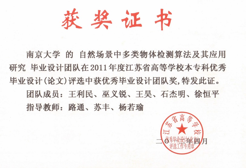 9. As the 1st supervisor, the thesis titled "Research on Multiclass Object Detection Algorithm and Its Applciations" won the First Prize of Excellent BSc Thesis Team of Jiangsu Province (The first team won this award in the Dept. of Computer Science and Technology, Nanjing University), 2011